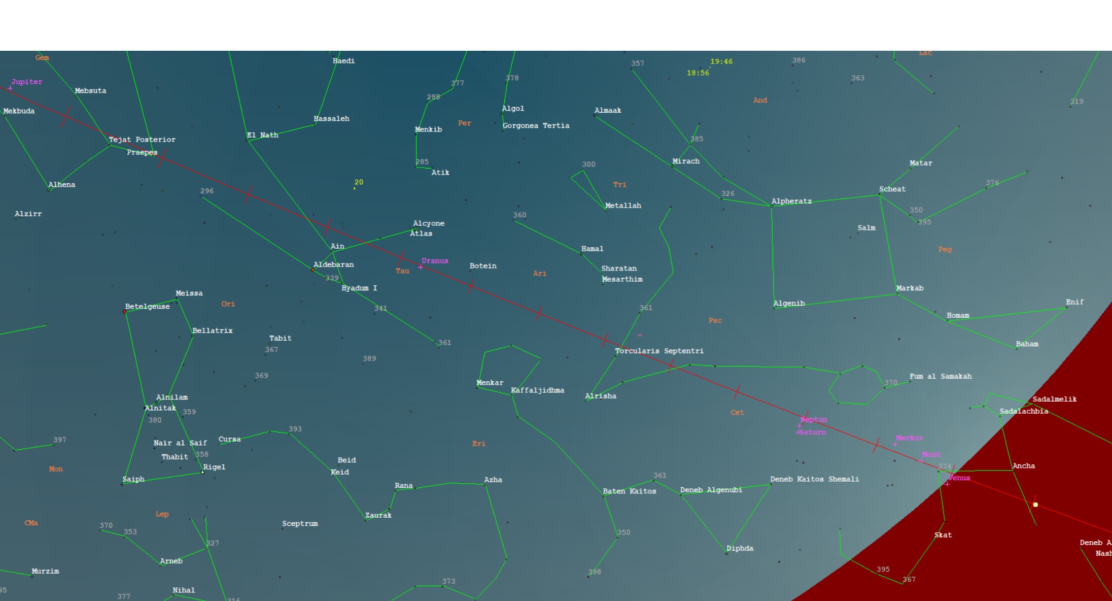 weiter östlich Saturn und daneben, mit bloßem Auge unsichtbar, den Neptun
